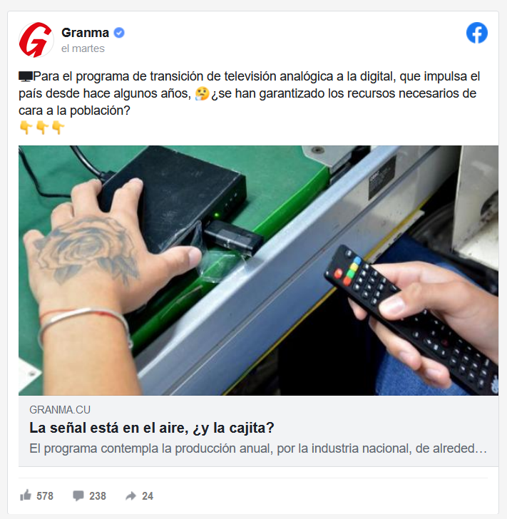 Así lo explica un reporte del diario oficialista Granma, que refiere que el programa de transición de televisión analógica a la digital, no ha cumplido con las cifras esperadas, debido a la crisis económica y supuestamente la inclusión de Cuba en la lista de países patrocinadores del terrorismo.